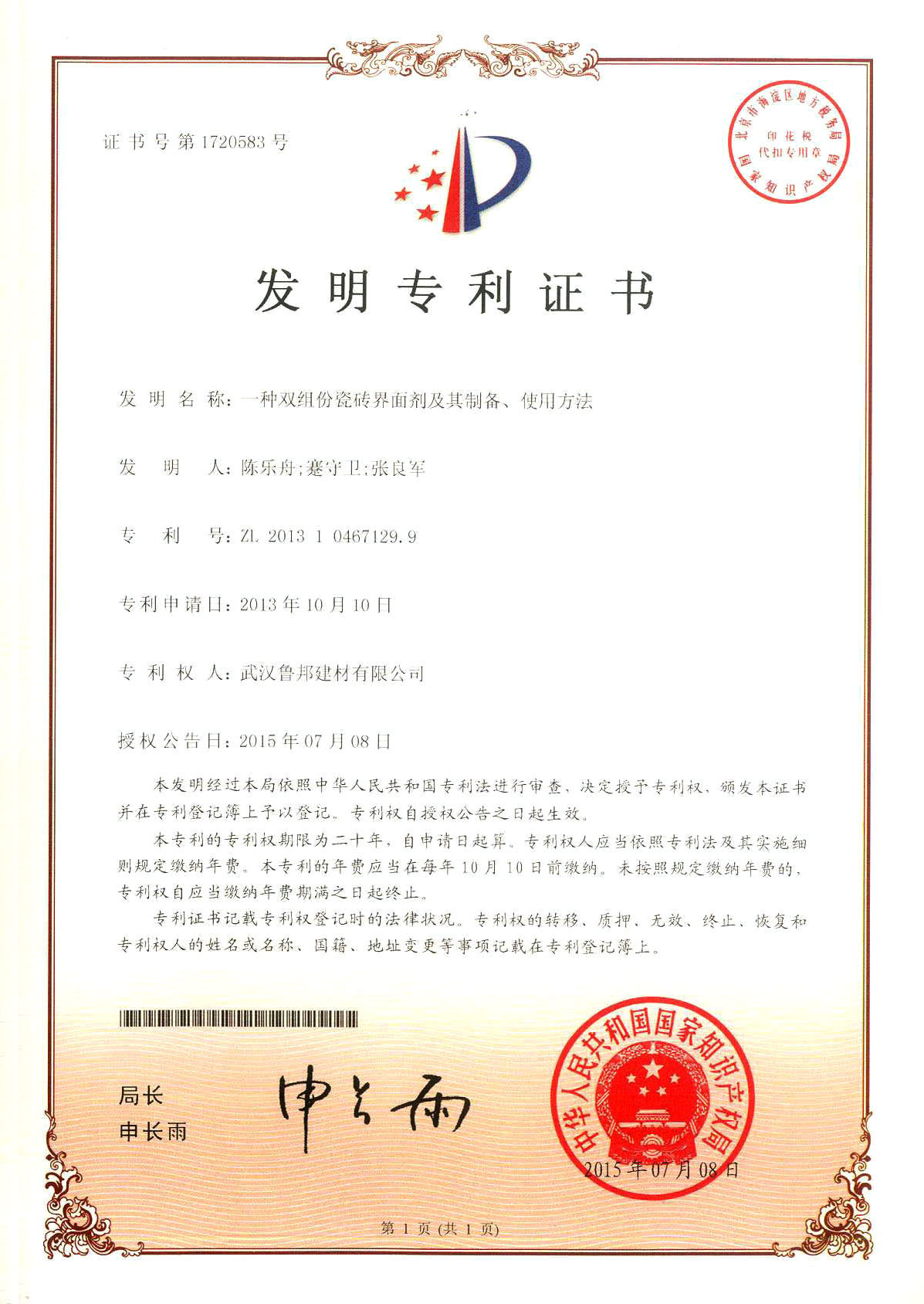 本產(chǎn)品是湖北魯邦建材股份有限公司技術(shù)研發(fā)中心開發(fā)的一種擁有國家發(fā)明專利(專利號:ZL2013104671299)的新型瓷磚粘結(jié)界面材料,由國際大品牌高分子聚合物及優(yōu)質(zhì)改性劑復(fù)合精制而成,能極大的釋放大部分?;u等高密度低吸水率磚與粘結(jié)材料之間的應(yīng)力,明顯的提高?;u等高密度低吸水率磚的粘結(jié)效果,不易空鼓,不易掉磚,直接解決大磚及高密度低吸水率磚粘貼難的問題。