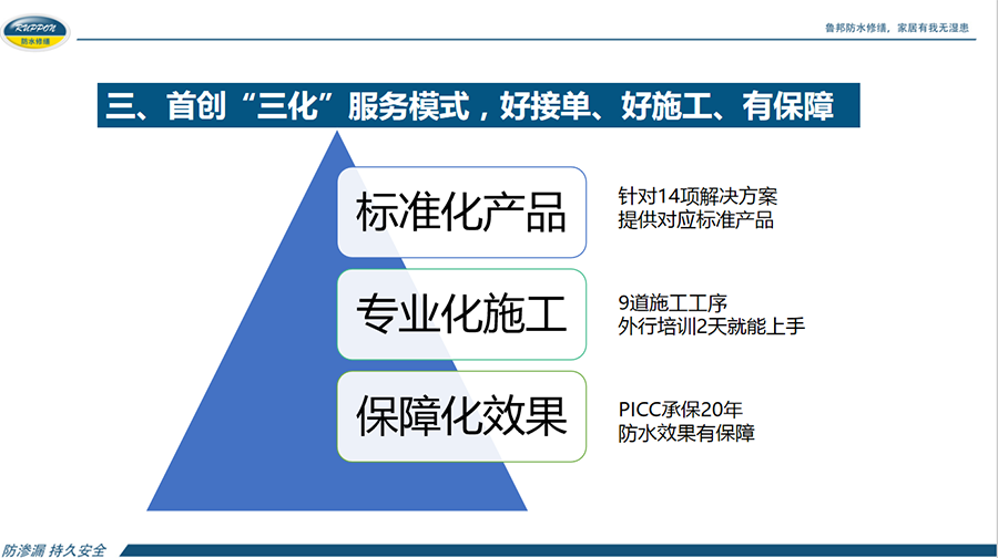 中國(guó)物業(yè)管理協(xié)會(huì),在協(xié)助政府制定行業(yè)改革方案、發(fā)展規(guī)劃、產(chǎn)業(yè)政策等方面發(fā)揮重要作用并設(shè)有物業(yè)維修資金研究專(zhuān)業(yè)委員會(huì)。湖北魯邦建材股份有限公司在全國(guó)率先成立魯邦防水修繕?lè)?wù)中心,緊緊圍繞老城區(qū)、老小區(qū)作房屋防水修繕?lè)?wù),切實(shí)的為廣大居民解決生活煩惱且協(xié)助物業(yè)公司與居民構(gòu)建了和諧關(guān)系。探索出了一套具有魯邦特色、可持續(xù)發(fā)展的商業(yè)模式,得到物業(yè)行業(yè)的認(rèn)可。幾年來(lái),全國(guó)多地知名物業(yè)企業(yè)紛紛前來(lái)考察交流,提升了魯邦防水修繕?lè)?wù)中心行業(yè)對(duì)外形象。魯邦防水修繕?lè)?wù)中心在全國(guó)舊房防水修繕市場(chǎng)環(huán)境下成長(zhǎng)為知名品牌企業(yè),建立了“三化”服務(wù)模式對(duì)行業(yè)更具有起到了帶好頭的榜樣。